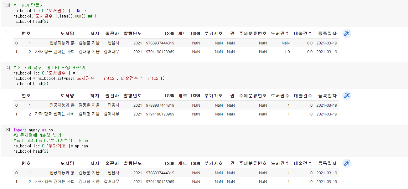 3. 문자열에는 그냥 None을 넣으면 None이라고 나온다. 실제 판다스에서 NaN이란 값은 없다. 그래서 넘파이 패키지의 np.nan을 사용해야 한다.