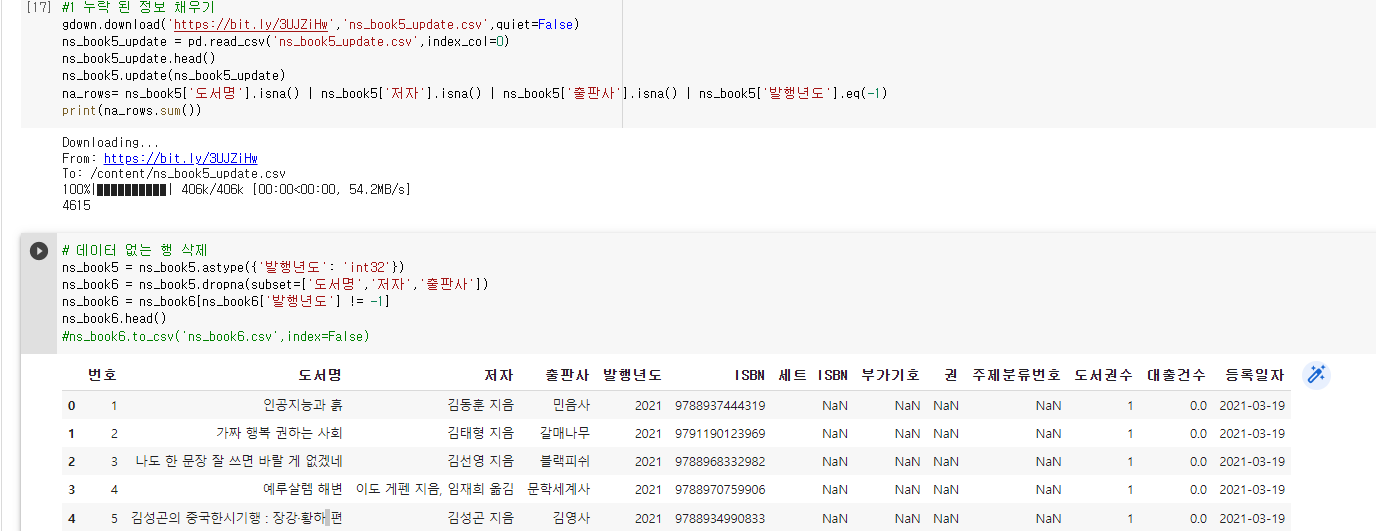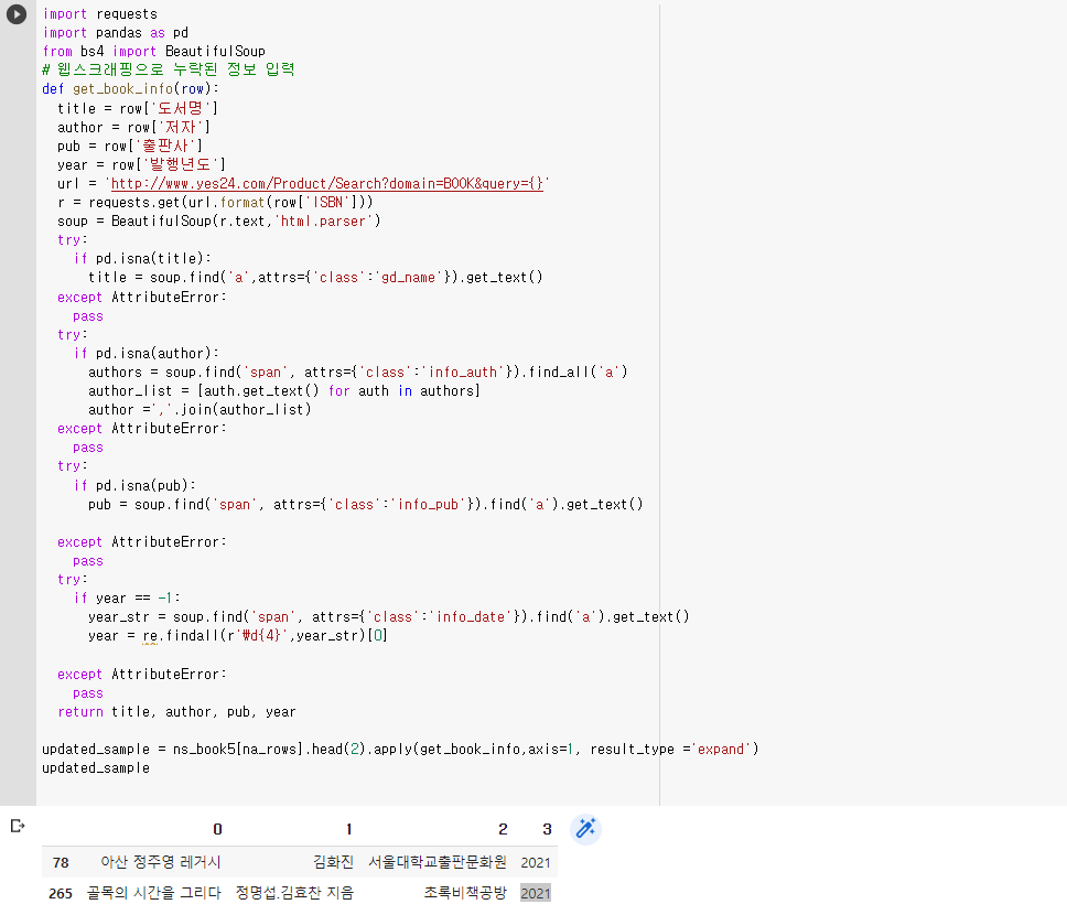 beautifulsoup를 이용한 웹스크래핑을 통해 누락된 정보를 얻어 데이터 업데이트 저자의 경우 여러명이 있어서 findall 메소드를 이용하여 전체 저자 입력. '-1'의 경우는 파이썬 RE모듈을 이용하여 정규식에 매칭되는 모든 문자열을 찾아 리스트로 반환한다. 이 함수의 첫번째 매개변수는 원하는 정규식이고 두 번째 매개변수는 검색 대상 문자열입니다. 이 중 연도만 추출한다.