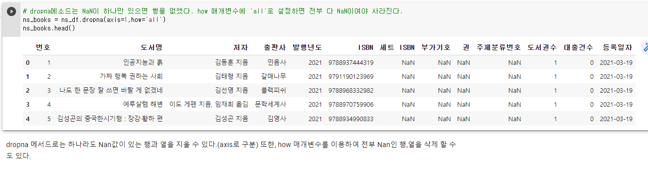 <drop 메소드로 열 삭제 > - NaN 데이터 없애기
