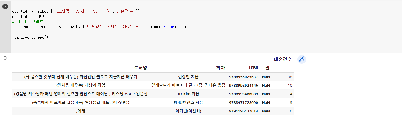 데이터 그룹화 하기. 제일 어려웠다. groupby로 지정한 열 값이 같은 항목들을 합친다. 기준 열 지정하고 dropna로 NaN을 해제하고(하나라도 NaN인 행은 삭제하기 때문에) 각 기준이 중복되는 것들은 전부 다 합친다. 정수인 대출건수는 끝에 .sum()메서드를 이용하여 합친다.