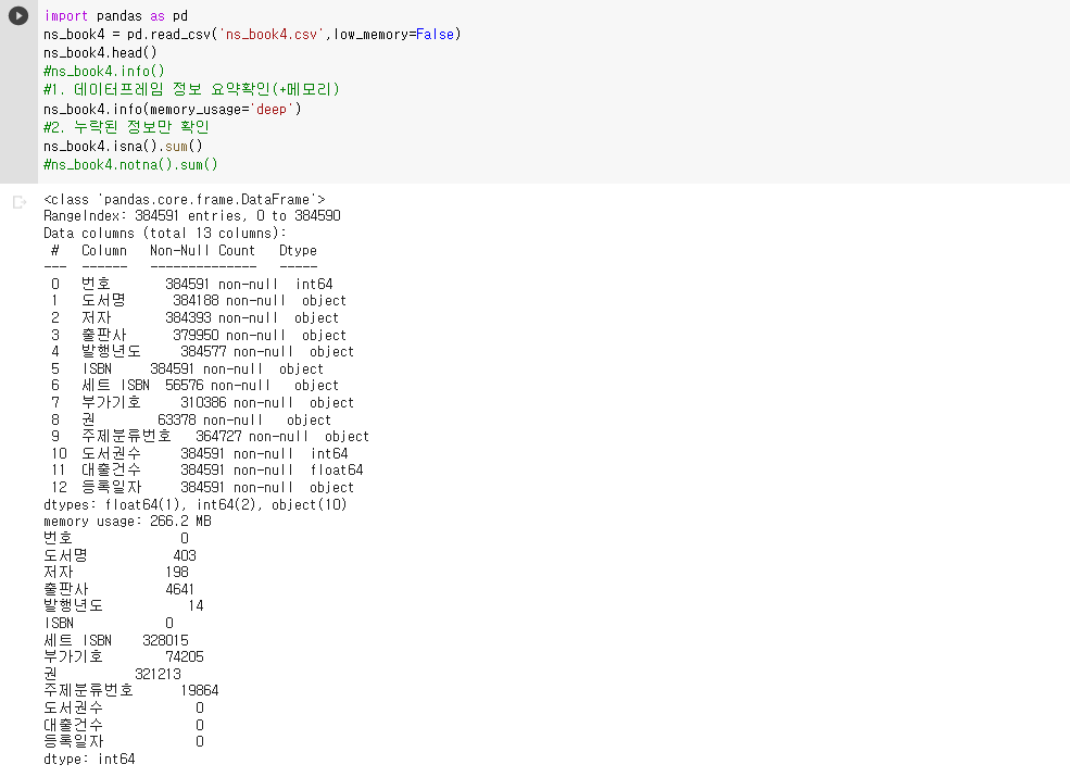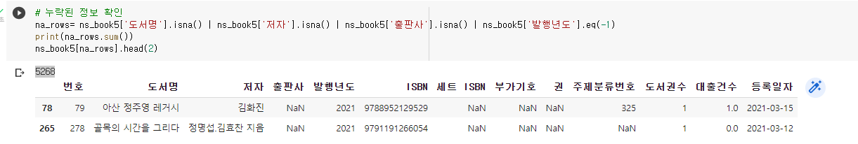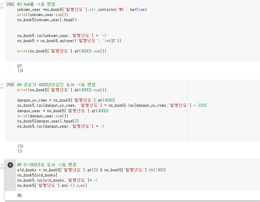 1 발행년도 열에 년도말고 다른 값이 1777개나 있다. contain 메소드와 정규식 \D(\d의 반대로 모든 문자)로 년도외의 다른 문자가 들어있는 행의 갯수와 데이터프래임을 만들었다. 또한 매개변수 na=True로 데이터가 없을 경우도 True로 나타내었다.
