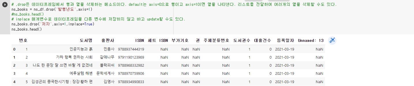 drop은 데이터프레임에서 행과 열을 삭제하는 메소드이다. default는 axis=0으로 행이고 axis=1이면 열을 나타낸다. 리스트를 전달하여 여러개의 열을 삭제할 수도 있다. inplace 매개변수로 데이터프레임을 다른 변수에 저장하지 않고 바고 update할 수도 있다.