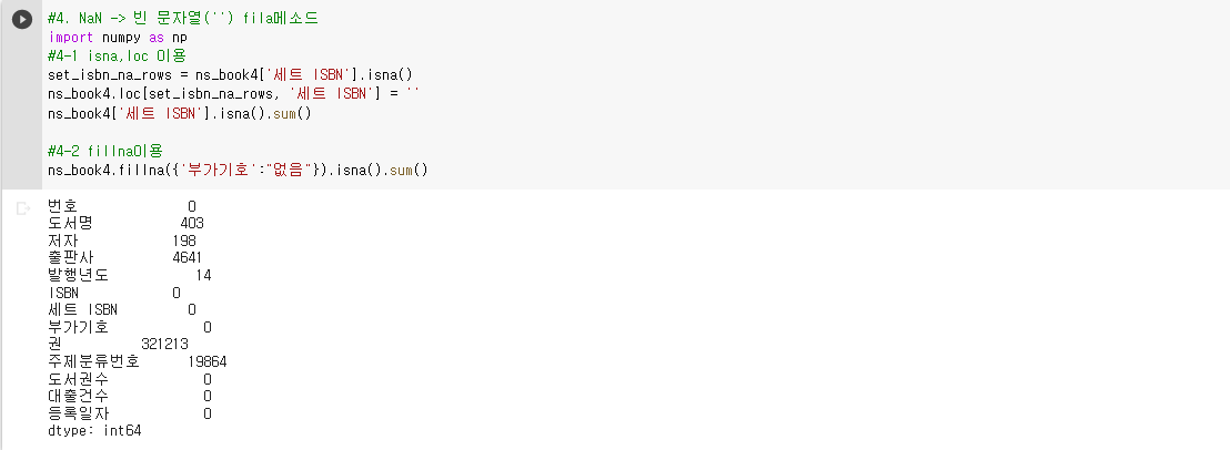 4-1. NaN을 빈문자열로 변경하기 위해서 isna()메소드로 NaN데이터이면 True인 불리언배열을 얻는다. 이를 loc메소드를 이용하여 구간 지정 후 ''로 변환한다.