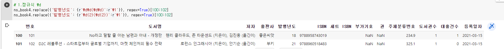 1 \d : 정규표현식은 패턴을 찾아서 대체하는 규칙의 모음이고 파이썬에서는 r''로 정규표현식을 다른 표현식과 구분한다. \d는 숫자를 나타내는 기호이다. 따라서 년도 숫자를 정규표현식으로 나타내면 \d\d\d\d이고 ()를 치면 그룹화 할 수 있다. \1과 같은 표현식으로 그룹을 지정할 수 있다. 또한 정규식을 사용한다는 표시로 regex매개변수를 True로 바꾼다. 똑같은 정규식을 연속으로 사용하면 중가로 치고 숫자를 넣어 대체할 수 있다.