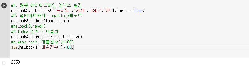 대출건수 100이상인 도서목록이 그룹화과정을 거치고 나서 2311->2550으로 줄어듬. 그만큼 중복된 도서목록들을 합친 것.
