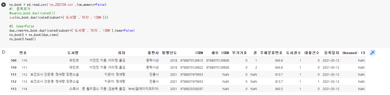 2. keep매개변수를 False로 설정하면 리턴되는 불리언 배열에 중복 된 행은 True로 Check