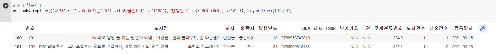 2 문자 찾기: 마침표(.) : 마침표는 모든 문자열을 대체한다. 문자열의 사이즈는 알 수없기 때문에 .*로 표시한다. 저자에서 (지은이),(옮긴이)는 전부 똑같이 존재하기 때문에 공백문자 \s와 일반 문자와 구분하기 위해 (,)사용한다. 변경할 값으로는 그룹화한 \1,\2를 사용한다.