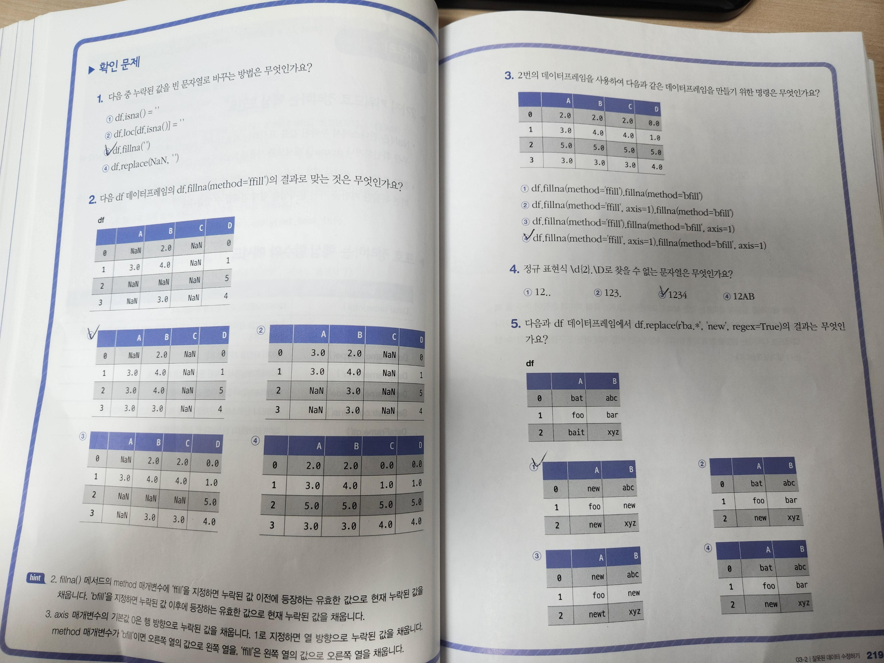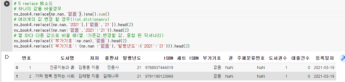 5 replace 메소드를 이용하여 1)하나의 데이터를 바꿀 떄, 2)여러개의 값을 변경할 때(list,dictionary데이터타입 사용가능),3)열마다 다른값으로 바꿀때(열 :기존값,변경할 값, 중첩 된 딕셔너리) 사용한다.