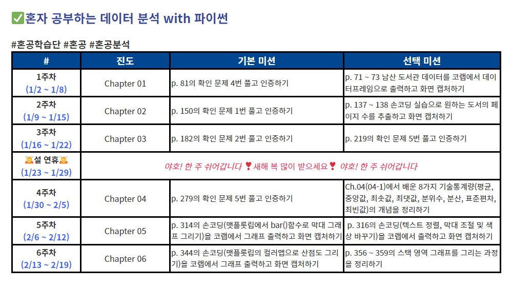 [혼공학습단 9기]혼자 공부하는 데이터 분석 with 파이썬 4주차 미션-2 (0) 2023.02.05 [혼공학습단 9기]혼자 공부하는 데이터 분석 with 파이썬 4주차 미션-1 (0) 2023.02.05 [혼공학습단 9기]혼자 공부하는 데이터 분석 with 파이썬 3주차 미션 (0) 2023.01.24 [혼공학습단 9기]혼자 공부하는 데이터 분석 with 파이썬 2주차 미션 (0) 2023.01.15 [혼공학습단 9기]혼자 공부하는 데이터 분석 with 파이썬 1주차 미션 (0) 2023.01.06
