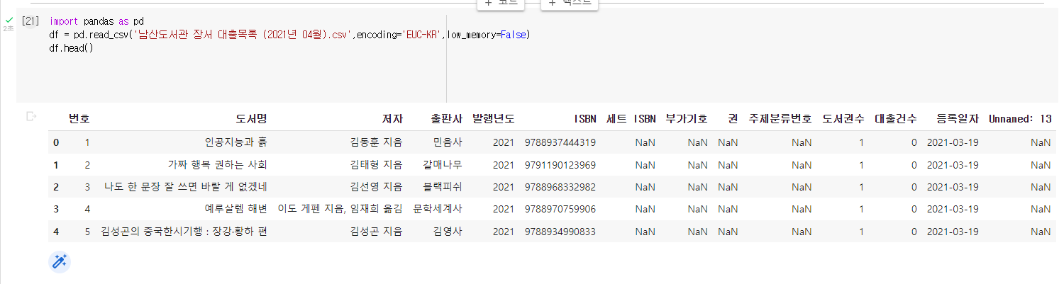 <남산 도서관 데이터를 코랩에서 데이터프레임으로 출력하고 화면 캡처> 1주차라 가볍게 진행했다. 오히려 데이터 분석,과학이 무엇인지 알아서 좋았던 시간이다.